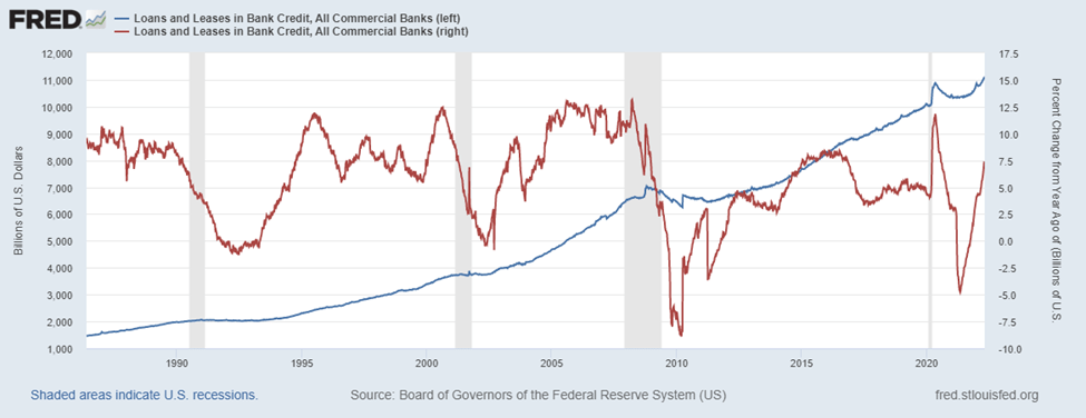 In 2021, a little less than two-thirds of total revenue for US banks was derived from “net interest income” or “spread revenue”. There are two factors driving higher spread income in 2022: rising interest rates and loan growth. In a recent report, the OCC (bank regulator) estimated the benefit from rising interest rates for about 1,000 mid-size and community banks to be 4-7% of spread income for the median bank. For the broader industry, with spread revenue of $530.4 billion in 2021 this would equate to $21-37 billion of growth in 2021.