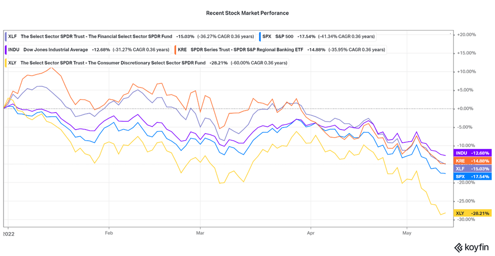 In the graph above, KRE is the US Regional Bank ETF, XLF is the US Financial Sector ETF, and XLY is the US Consumer Discretionary Sector ETF.